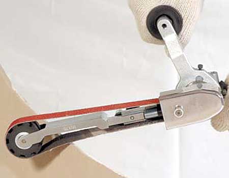15300 Dynafile® III abrasive belt tool is run with 15375 Contact Arm, which allows finishing and polishing with the slack of the belt. Ideal for use on rough edges of trimmed pieces. The tool also accepts a wide range of additional contact arms, to suit many other applications.